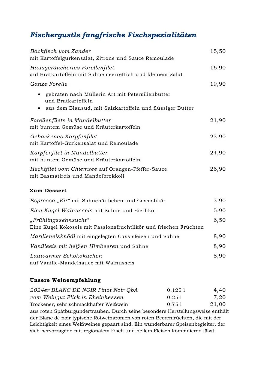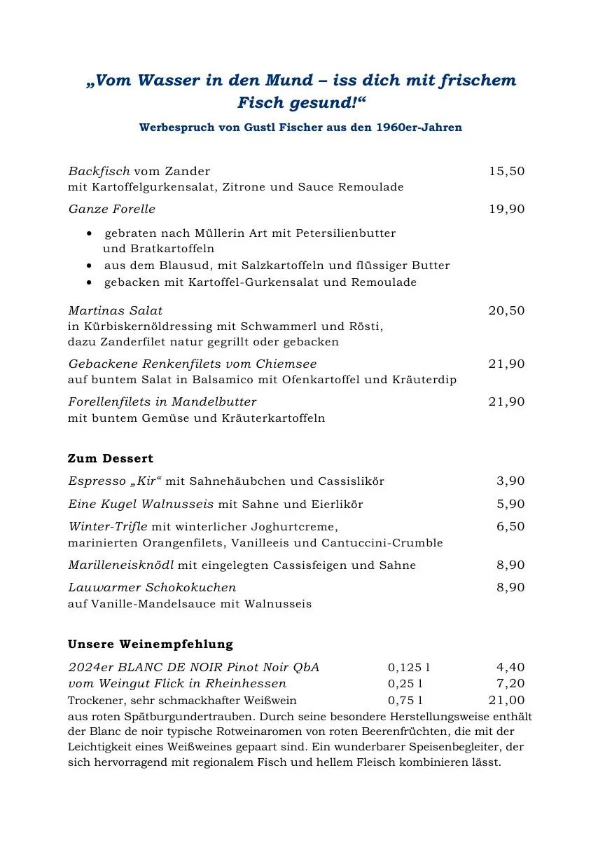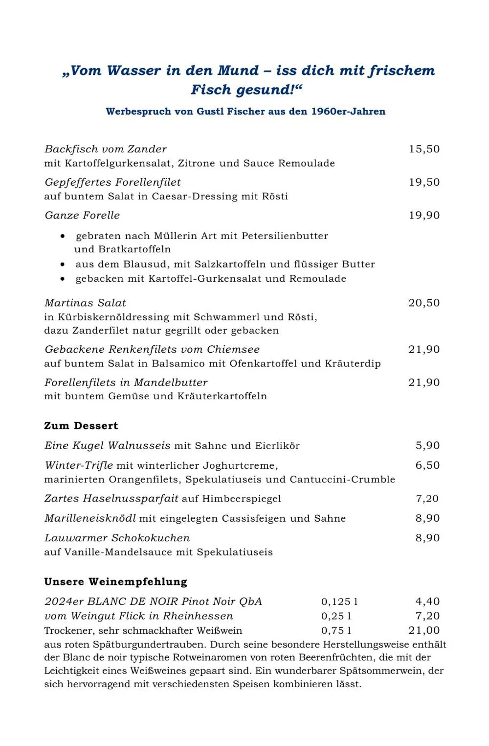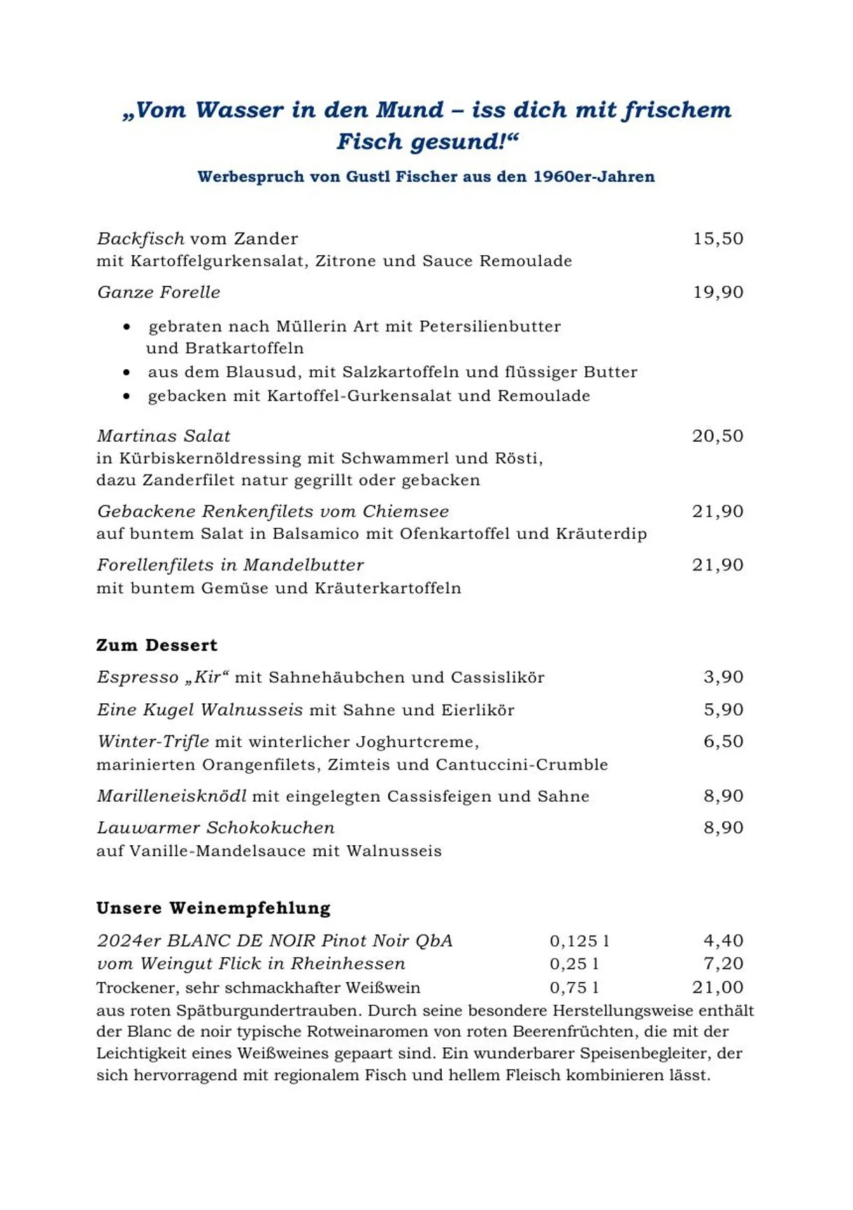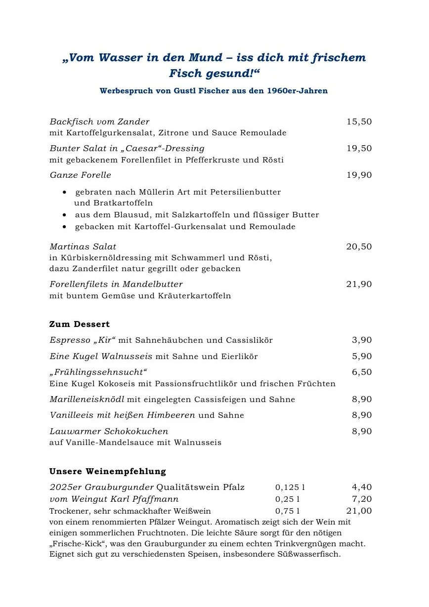 “Auf unserer Speisekarte finden Sie neben unseren Klassikern auch regelmäßig wechselnde Gerichte der Saison. Dazu bieten wir ständig wechselnde Tagesempfehlungen auf unserer Tafel. Bei allen Speisen und Zutaten legen wir großen Wert auf eine hohe Qualität im Einkauf und bei der Zubereitung. Wir wünschen guten Appetit und schöne Stunden im Fischerstüberl!
