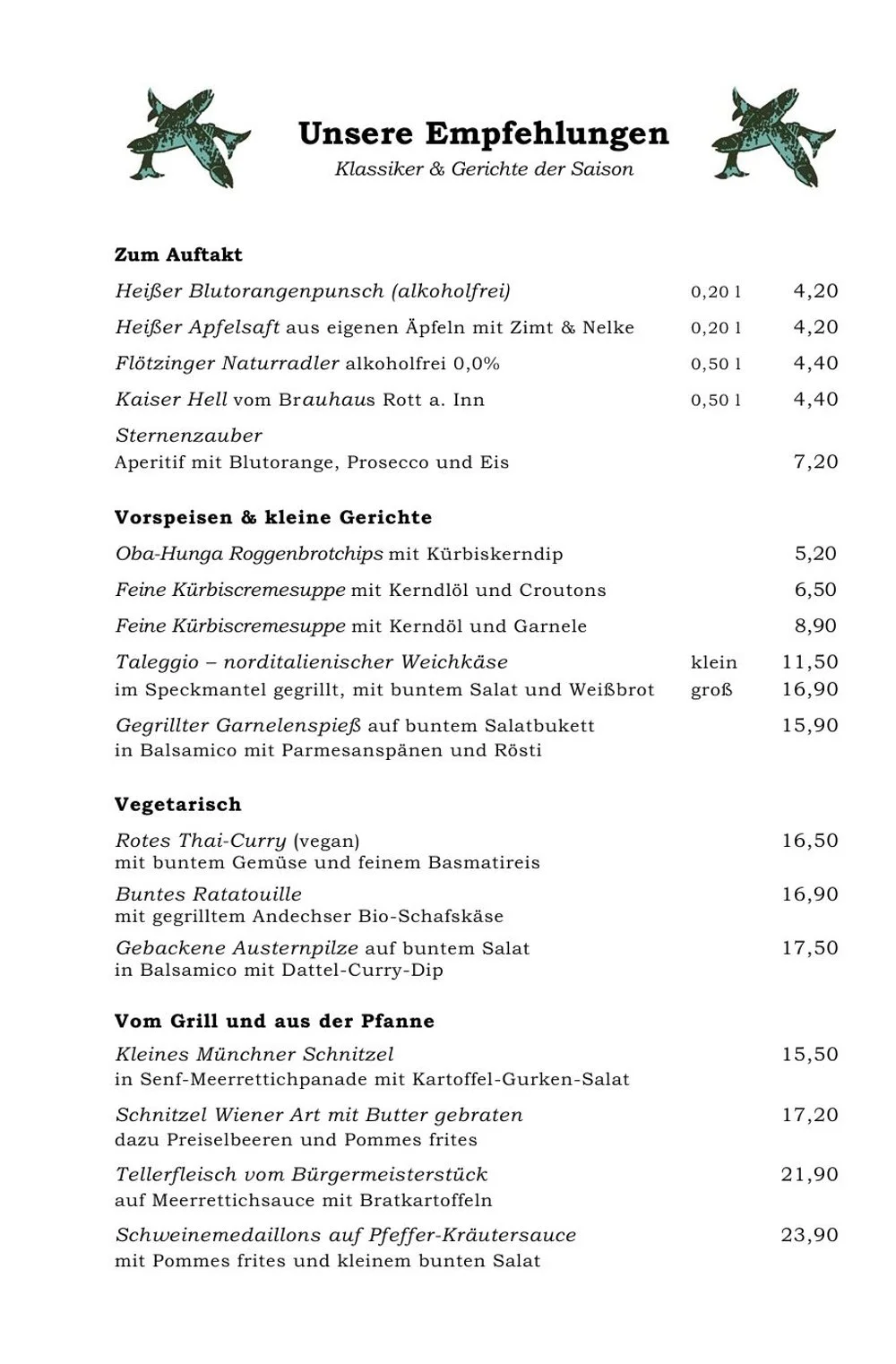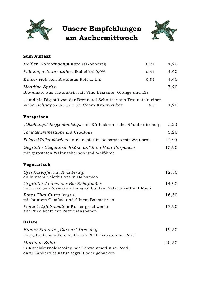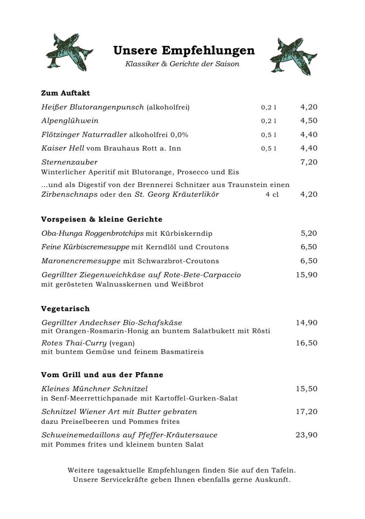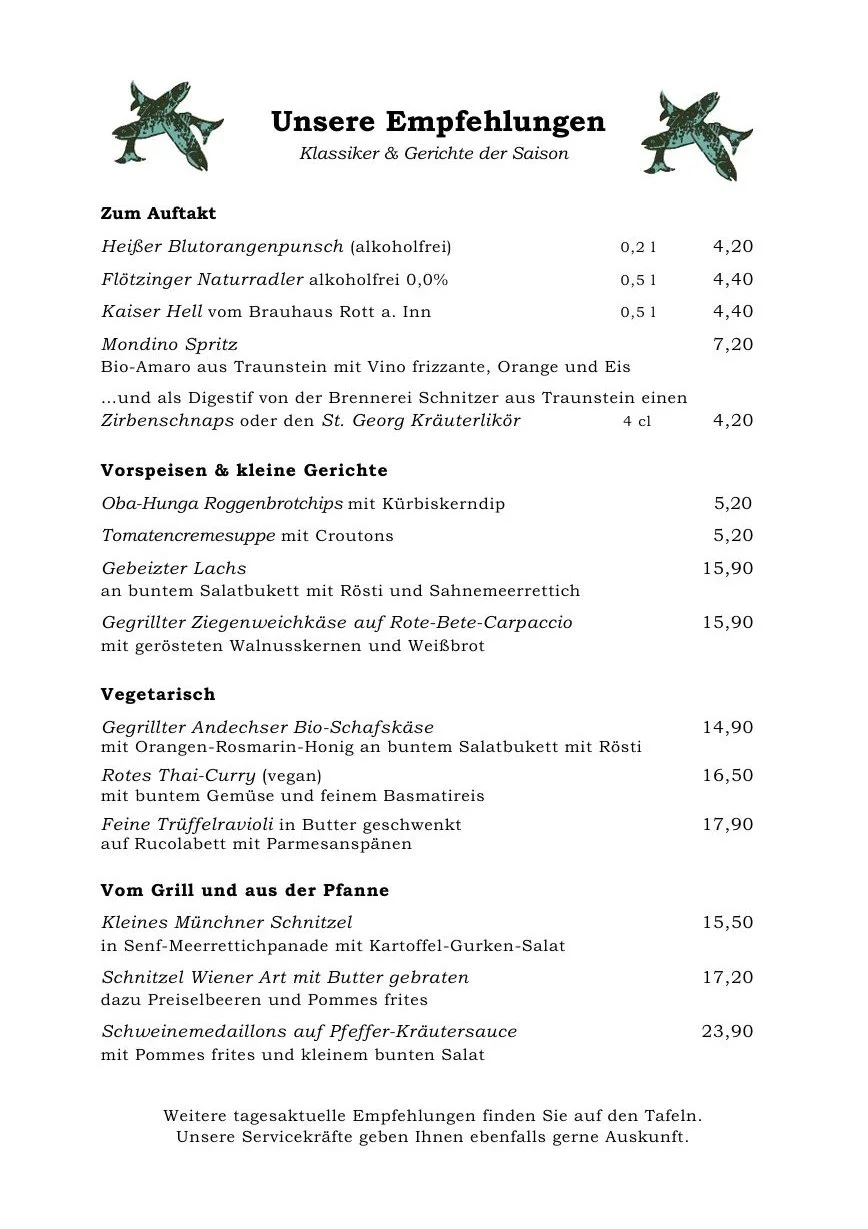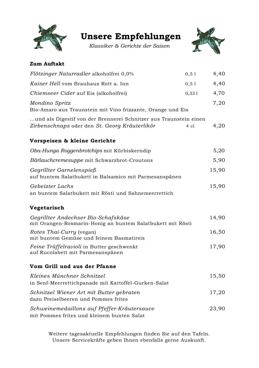 “Auf unserer Speisekarte finden Sie neben unseren Klassikern auch regelmäßig wechselnde Gerichte der Saison. Dazu bieten wir ständig wechselnde Tagesempfehlungen auf unserer Tafel. Bei allen Speisen und Zutaten legen wir großen Wert auf eine hohe Qualität im Einkauf und bei der Zubereitung. Wir wünschen guten Appetit und schöne Stunden im Fischerstüberl!